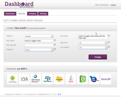 - This will take you to the Inneractive Dashboard. You’ll want to add your first app right away! Select Platform: Android, add your App Name, your website URL, Category, Description, Age Group, and whether you want Inneractive to use user locations to designate which advertisements are broadcast to them. Using location is likely to increase your click-through rate, so we recommend it. When you’re finished, click CREATE